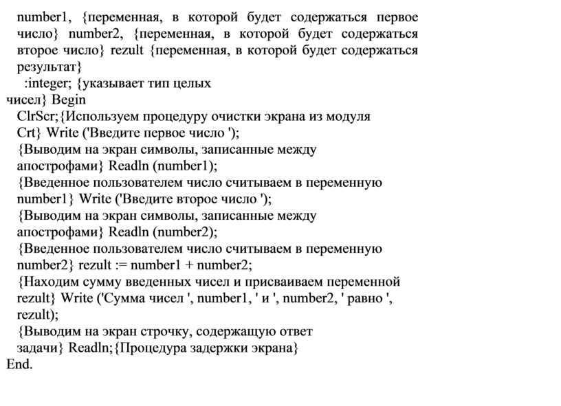 {Находим сумму введенных чисел и присваиваем переменной rezult} Write ('Сумма чисел ', number1, ' и ', number2, ' равно ', rezult);