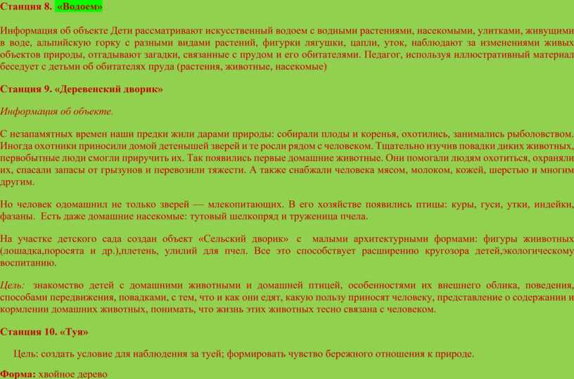 Информация об объекте Дети рассматривают искусственный водоем с водными растениями, насекомыми, улитками, живущими в воде, альпийскую горку с разными видами растений, фигурки лягушки, цапли, уток, наблюдают за изменениями живых объектов природы, отгадывают загадки, связанные с прудом и его обитателями. Педагог, используя иллюстративный материал беседует с детьми об обитателях пруда (растения, животные, насекомые)