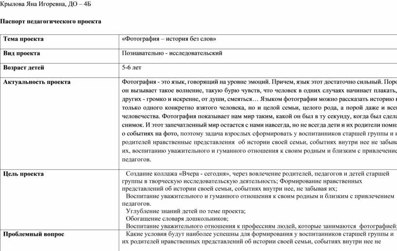 Паспорт педагогического проекта