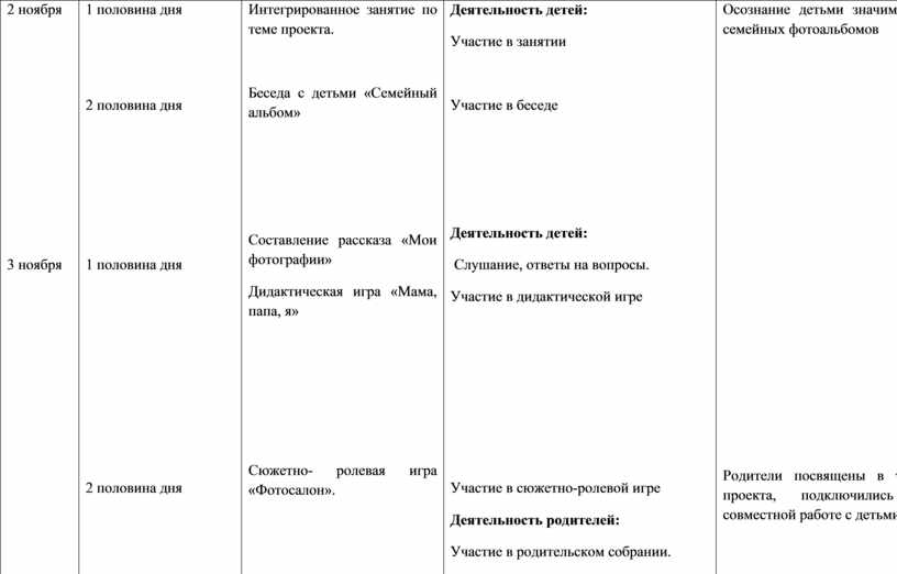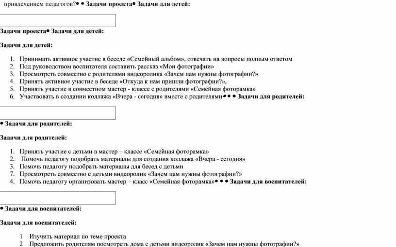 Задачи для воспитателей: 1 Изучить материал по теме проекта 2 Предложить родителям посмотреть дома с детьми видеоролик «Зачем нам нужны фотографии?» 3 Провести беседу с детьми «Семейный альбом», обращение к личному опыту детей 4 Провести тематические занятия с воспитанниками старшей группы «Моя семья - моё богатство» 5 Проинформировать родителей и специалистов ДОУ и других работников на сайте детского сада о предстоящем мероприятии. 6 Приобщать родителей к поиску материалов для создания коллажа «Вчера - сегодня» 7 Пополнять портфолио каждого воспитанника старшей 8 Провести мастер-класс для родителей и детей «Семейная фоторамка» 9 Подобрать памятки для родителей «Фото – просто!» 10 Дополнить РППС в группе для реализации цели и задач проекта 11 Подготовить благодарственные письма активным участникам проекта 12 Провести интегрированное занятие по теме проекта. 13 Закрепить полученные знания в сюжетно-ролевых, дидактических играх. 14 Чтение детям художественной литературы по теме проекта: Д.Габе «Моя семья», Г. Браиловская «Наши мамы, наши папы». |