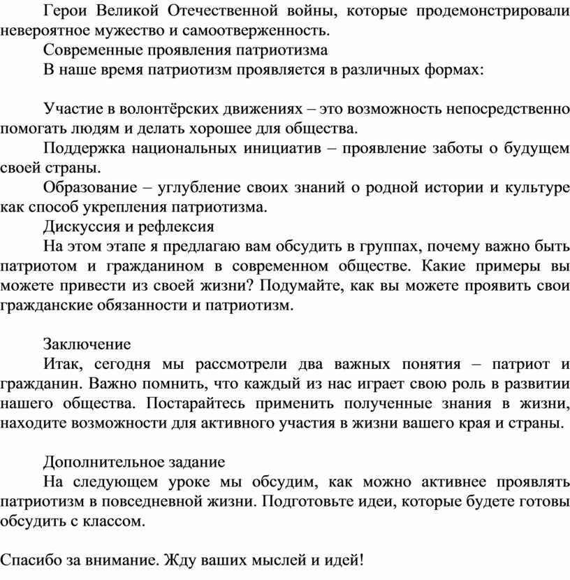 На следующем уроке мы обсудим, как можно активнее проявлять патриотизм в повседневной жизни. Подготовьте идеи, которые будете готовы обсудить с классом.