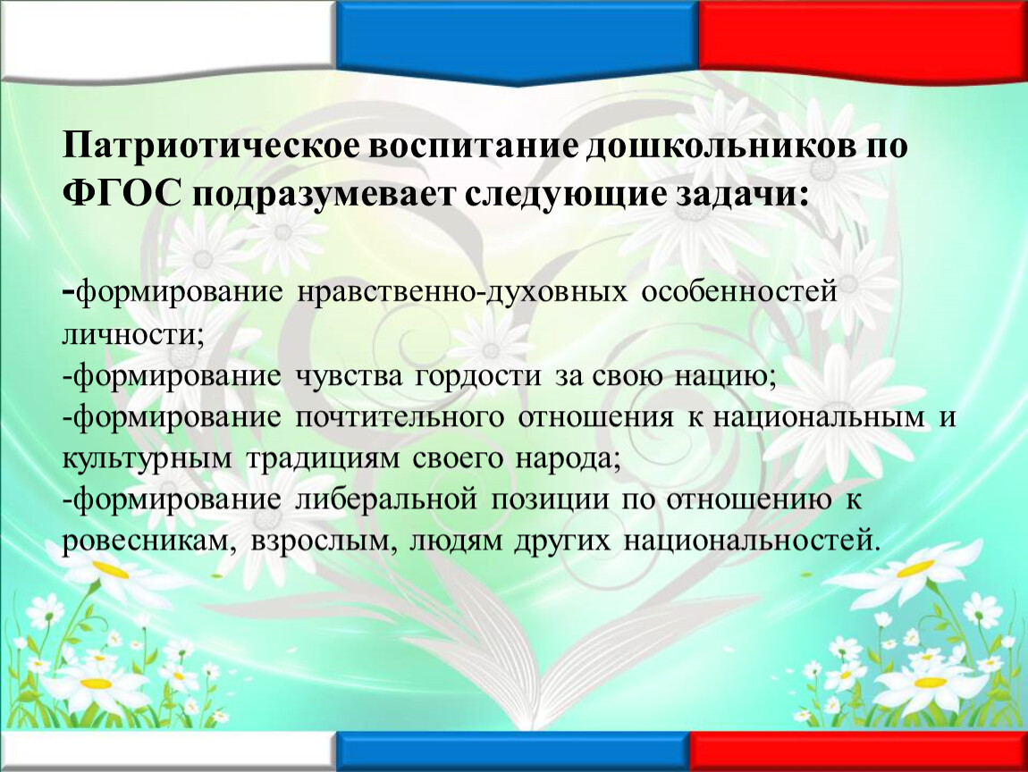 Патриотическое воспитание дошкольников по ФГОС подразумевает следующие задачи: -формирование нравственно-духовных особенностей личности; -формирование чувства гордости за свою нацию; -формирование почтительного отношения к национальным и культурным традициям своего народа; -формирование либеральной позиции по отношению к ровесникам, взрослым, людям других национальностей.
