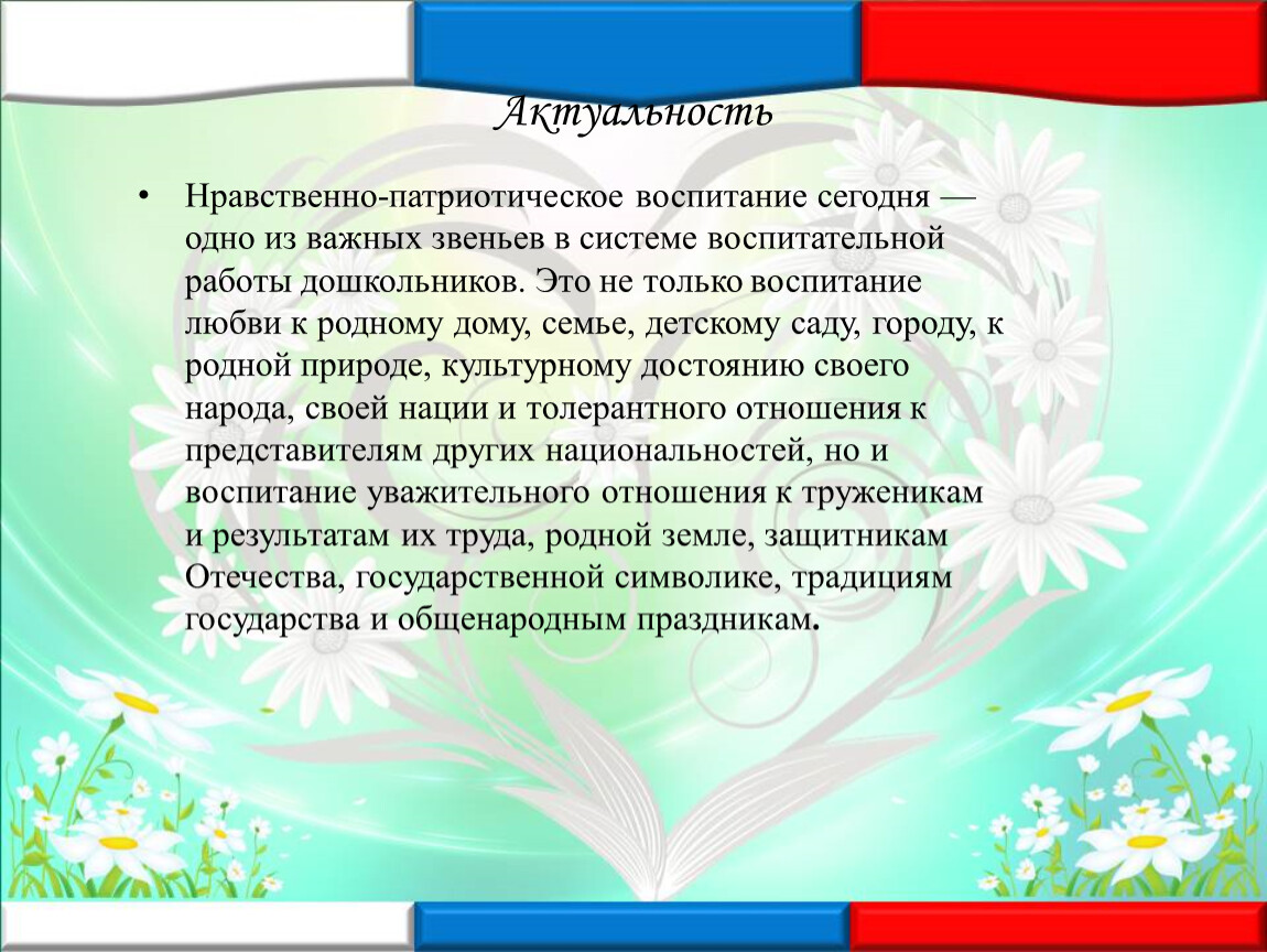 Нравственно-патриотическое воспитание сегодня — одно из важных звеньев в системе воспитательной работы дошкольников. Это не только воспитание любви к родному дому, семье, детскому саду, городу, к родной природе, культурному достоянию своего народа, своей нации и толерантного отношения к представителям других национальностей, но и воспитание уважительного отношения к труженикам и результатам их труда, родной земле, защитникам Отечества, государственной символике, традициям государства и общенародным праздникам.