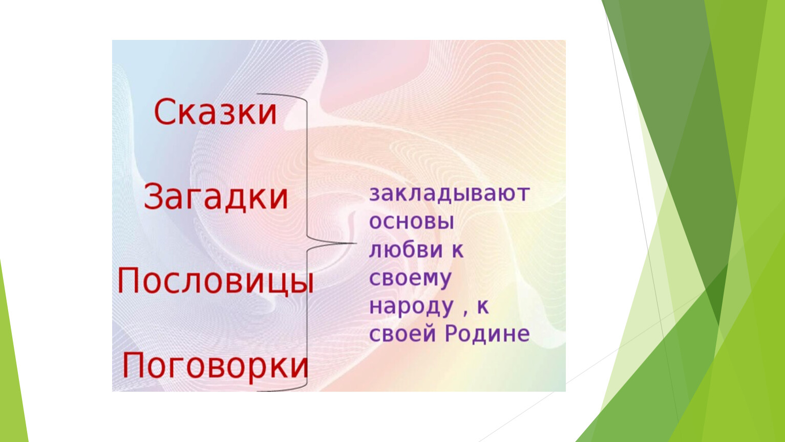 Чувство Родины связано с восхищением того, что видит перед собой малыш, чему он изумляется и что вызывает отклик в его душе… Это играет огромную роль в становлении личности патриота.С младенчества ребенок слышит родную речь. У каждого народа свои сказки, и все они передают из поколения в поколение основные патриотические ценности: добро, дружбу, взаимопомощь, трудолюбие