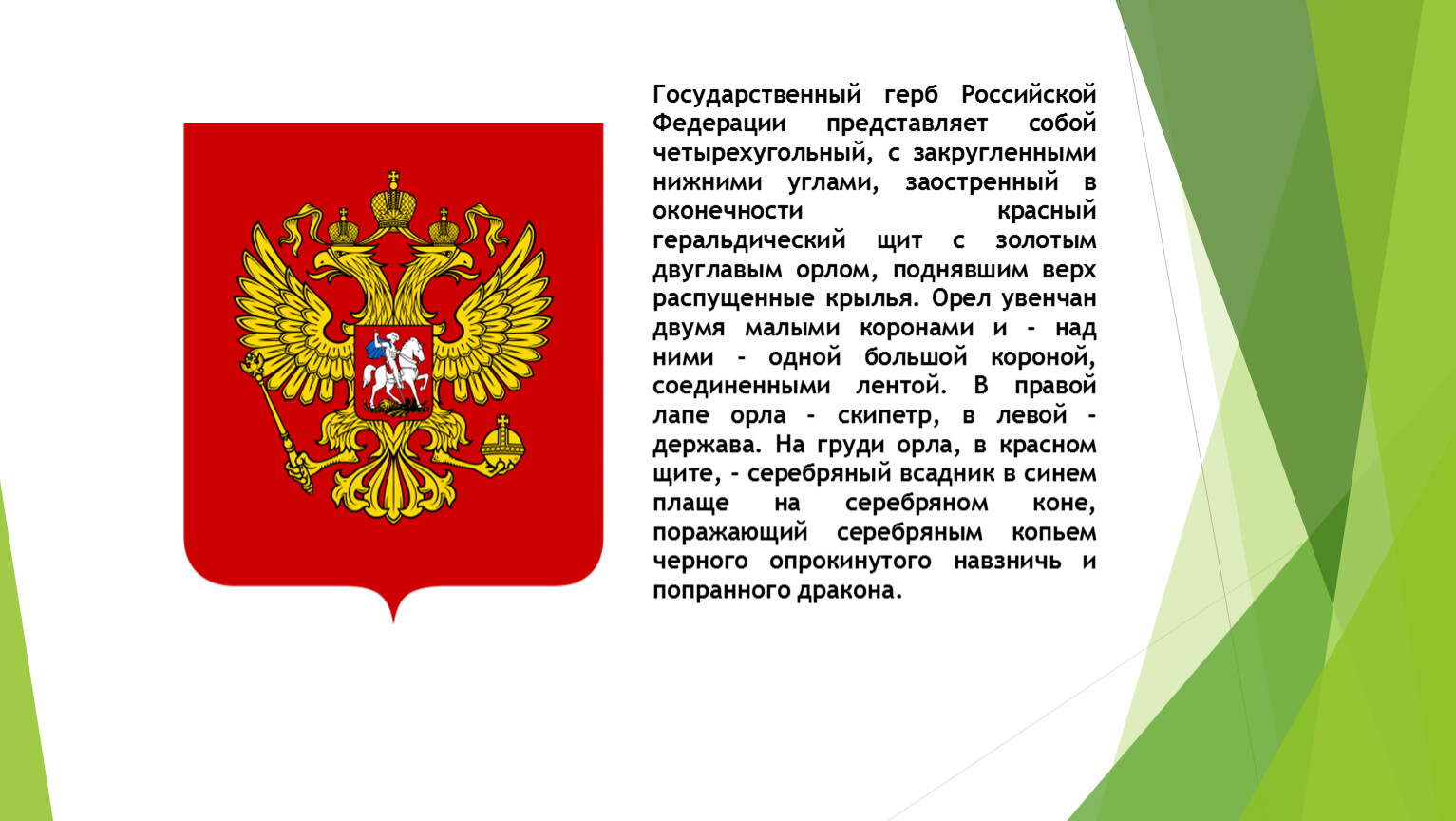 Государственный герб Российской Федерации представляет собой четырехугольный, с закругленными нижними углами, заостренный в оконечности красный геральдический щит с золотым двуглавым орлом, поднявшим верх распущенные крылья. Орел увенчан двумя малыми коронами и - над ними - одной большой короной, соединенными лентой. В правой лапе орла - скипетр, в левой - держава. На груди орла, в красном щите, - серебряный всадник в синем плаще на серебряном коне, поражающий серебряным копьем черного опрокинутого навзничь и попранного дракона.