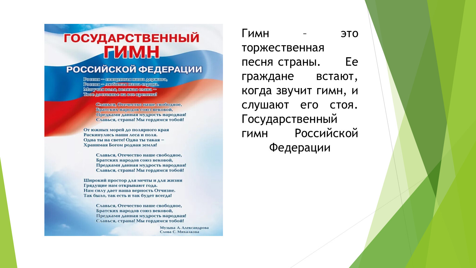 Гимн – это торжественная песня страны. Ее граждане встают, когда звучит гимн, и слушают его стоя.Государственный гимн Российской Федерации