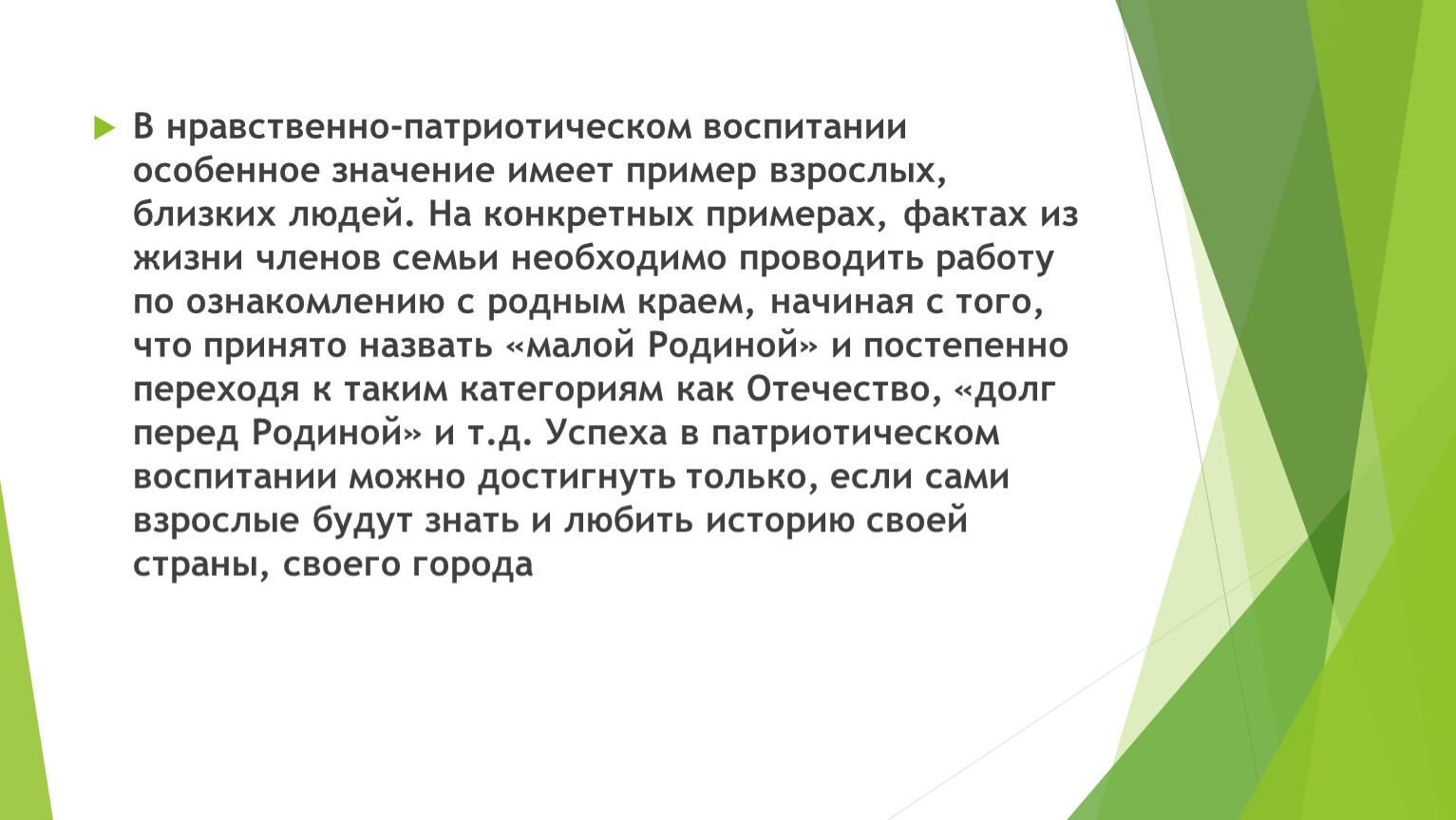 В нравственно-патриотическом воспитании особенное значение имеет пример взрослых, близких людей. На конкретных примерах, фактах из жизни членов семьи необходимо проводить работу по ознакомлению с родным краем, начиная с того, что принято назвать «малой Родиной» и постепенно переходя к таким категориям как Отечество, «долг перед Родиной» и т.д. Успеха в патриотическом воспитании можно достигнуть только, если сами взрослые будут знать и любить историю своей страны, своего города