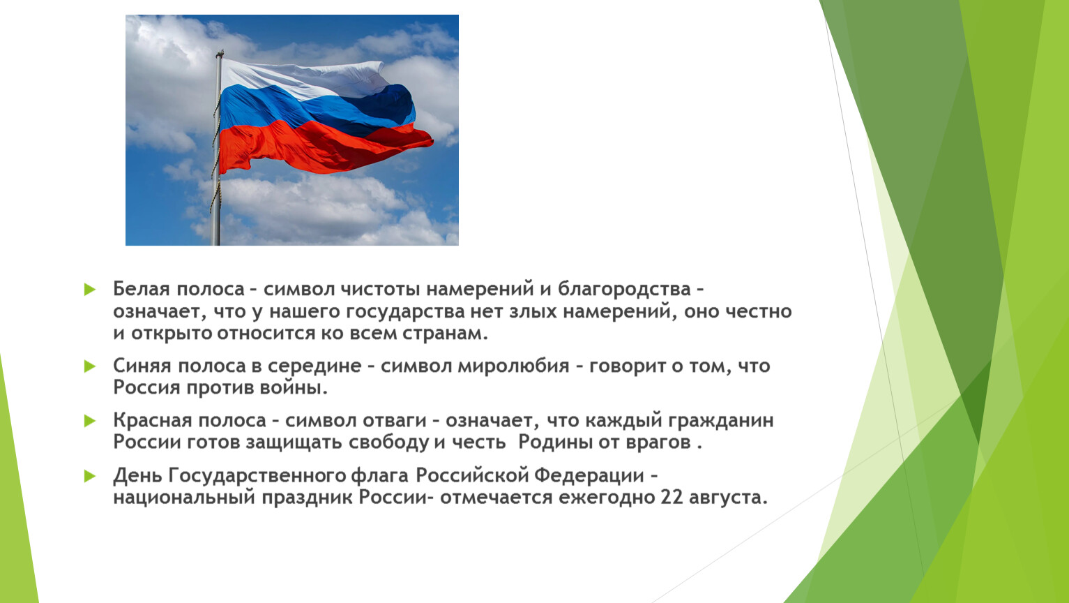 День Государственного флага Российской Федерации – национальный праздник России- отмечается ежегодно 22 августа.