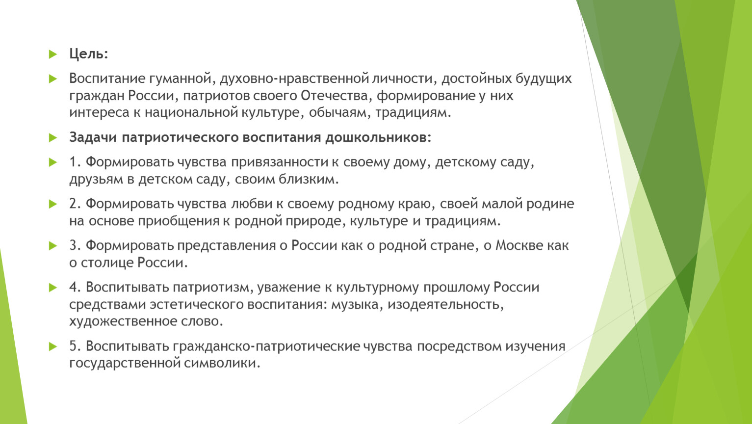 Задачи патриотического воспитания дошкольников: