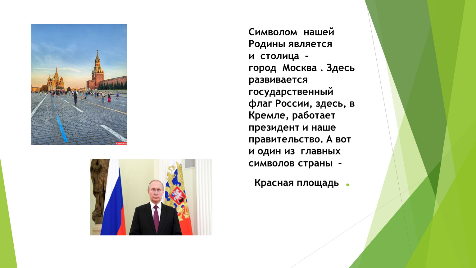 Символом нашей Родины является и столица – город Москва . Здесь развивается государственный флаг России, здесь, в Кремле, работает президент и наше правительство. А вот и один из главных символов страны – Красная площадь .