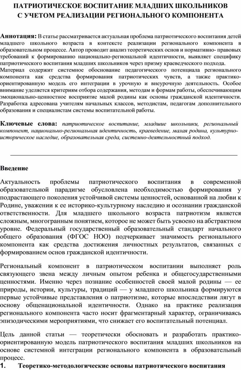 Ключевые слова: патриотическое воспитание, младшие школьники, региональный компонент, национально-региональная идентичность, краеведение, малая родина, культурно-историческое наследие, образовательная среда, системно-деятельностный подход.