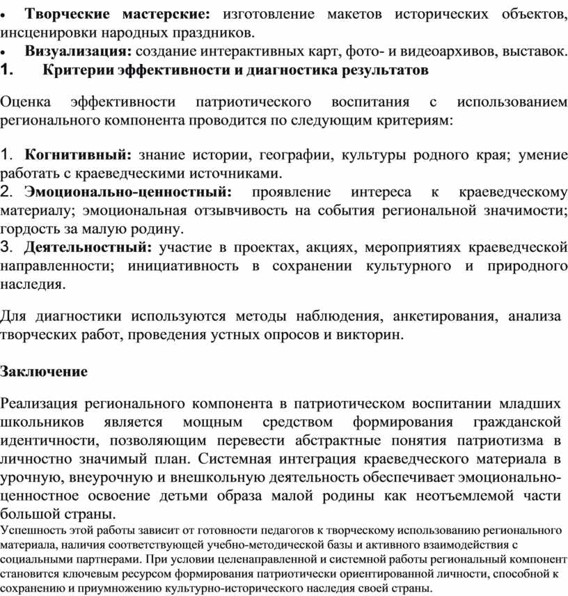Успешность этой работы зависит от готовности педагогов к творческому использованию регионального материала, наличия соответствующей учебно-методической базы и активного взаимодействия с социальными партнерами. При условии целенаправленной и системной работы региональный компонент становится ключевым ресурсом формирования патриотически ориентированной личности, способной к сохранению и приумножению культурно-исторического наследия своей страны.
