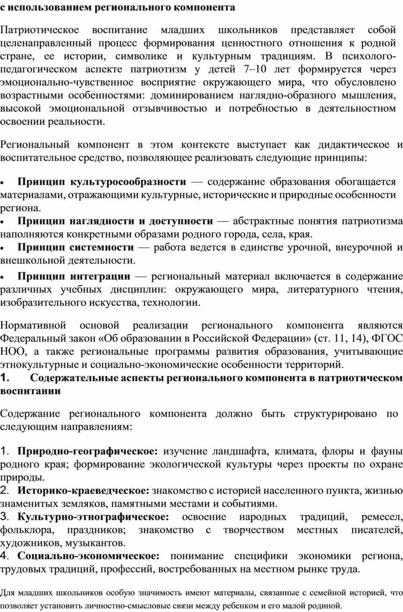 Нормативной основой реализации регионального компонента являются Федеральный закон «Об образовании в Российской Федерации» (ст. 11, 14), ФГОС НОО, а также региональные программы развития образования, учитывающие этнокультурные и социально-экономические особенности территорий.