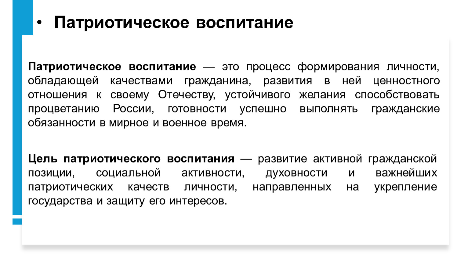 Патриотическое воспитание — это процесс формирования личности, обладающей качествами гражданина, развития в ней ценностного отношения к своему Отечеству, устойчивого желания способствовать процветанию России, готовности успешно выполнять гражданские обязанности в мирное и военное время.