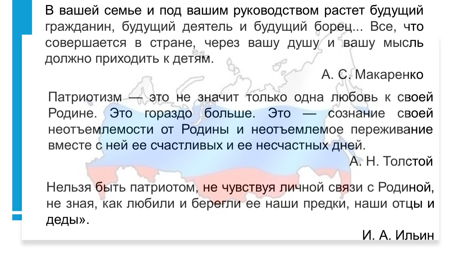 Патриотизм — это не значит только одна любовь к своей Родине. Это гораздо больше. Это — сознание своей неотъемлемости от Родины и неотъемлемое переживание вместе с ней ее счастливых и ее несчастных дней.