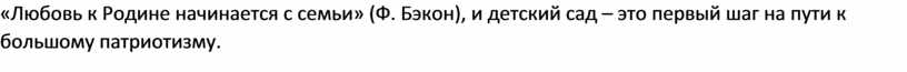 «Любовь к Родине начинается с семьи» (Ф. Бэкон), и детский сад – это первый шаг на пути к большому патриотизму.