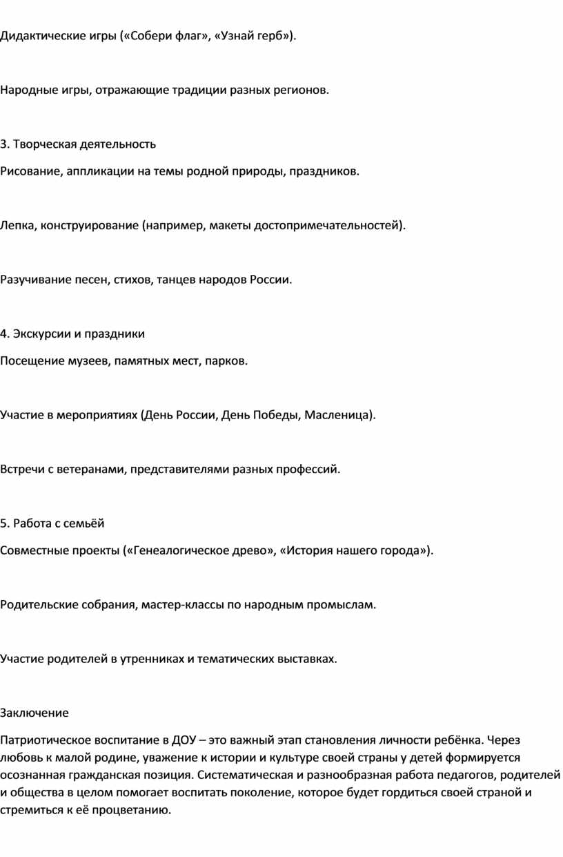 Патриотическое воспитание в ДОУ – это важный этап становления личности ребёнка. Через любовь к малой родине, уважение к истории и культуре своей страны у детей формируется осознанная гражданская позиция. Систематическая и разнообразная работа педагогов, родителей и общества в целом помогает воспитать поколение, которое будет гордиться своей страной и стремиться к её процветанию.