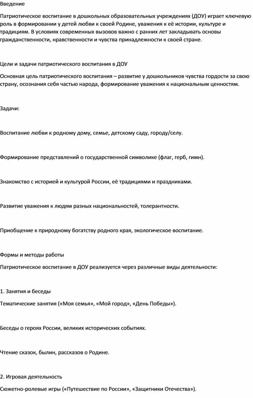 Патриотическое воспитание в дошкольных образовательных учреждениях (ДОУ) играет ключевую роль в формировании у детей любви к своей Родине, уважения к её истории, культуре и традициям. В условиях современных вызовов важно с ранних лет закладывать основы гражданственности, нравственности и чувства принадлежности к своей стране.