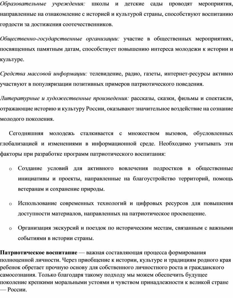 Сегодняшняя молодежь сталкивается с множеством вызовов, обусловленных глобализацией и изменениями в информационной среде. Необходимо учитывать эти факторы при разработке программ патриотического воспитания: