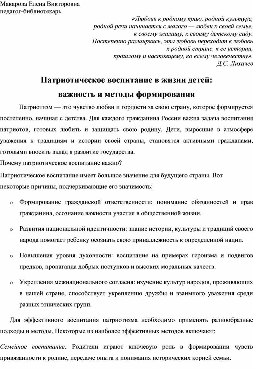 Патриотическое воспитание имеет большое значение для будущего страны. Вот некоторые причины, подчеркивающие его значимость: