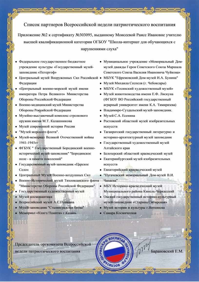 к сертификату №303095, выданному Моисеевой Раисе Ивановне учителю высшей квалификационной категории