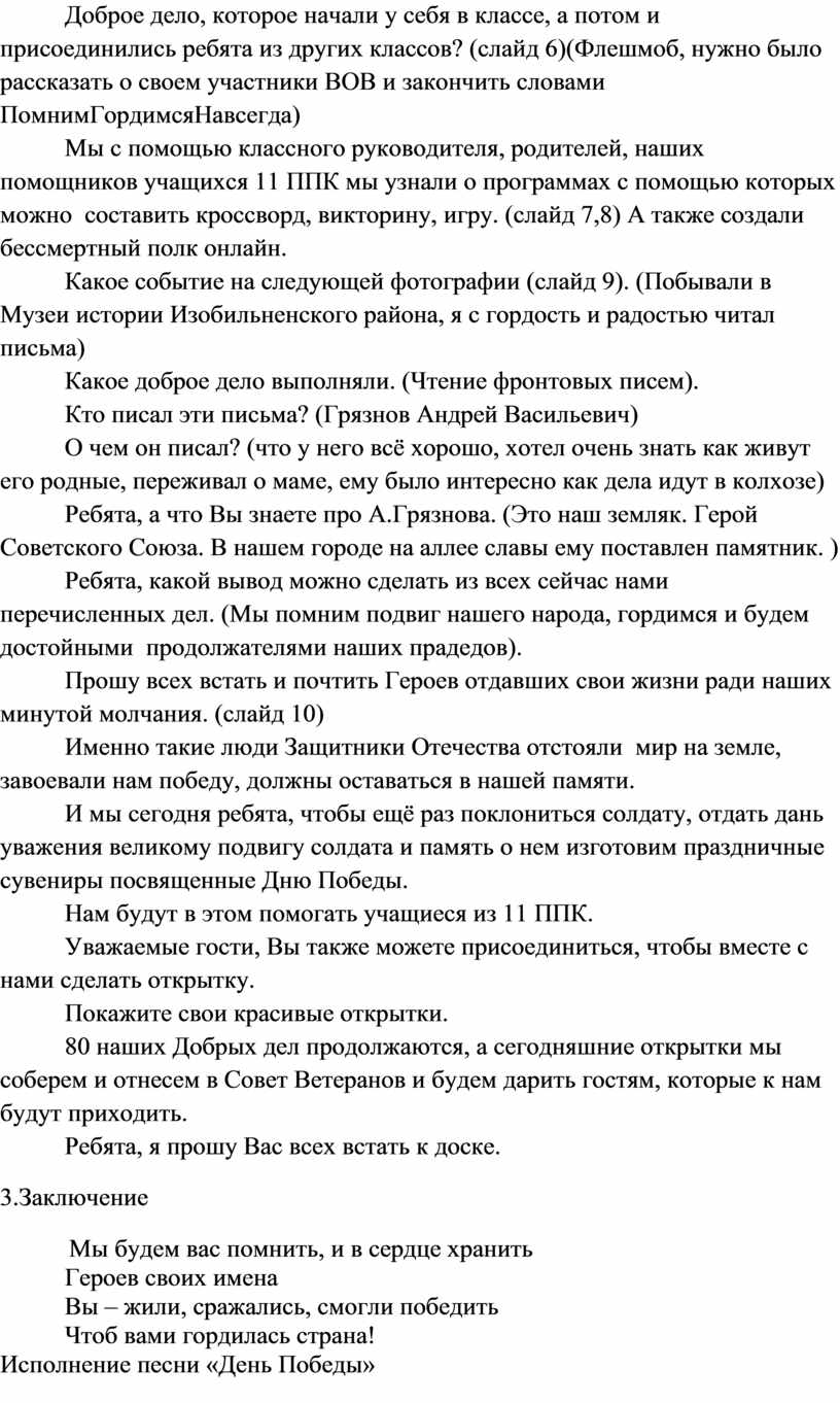 Ребята, какой вывод можно сделать из всех сейчас нами перечисленных дел. (Мы помним подвиг нашего народа, гордимся и будем достойными продолжателями наших прадедов).