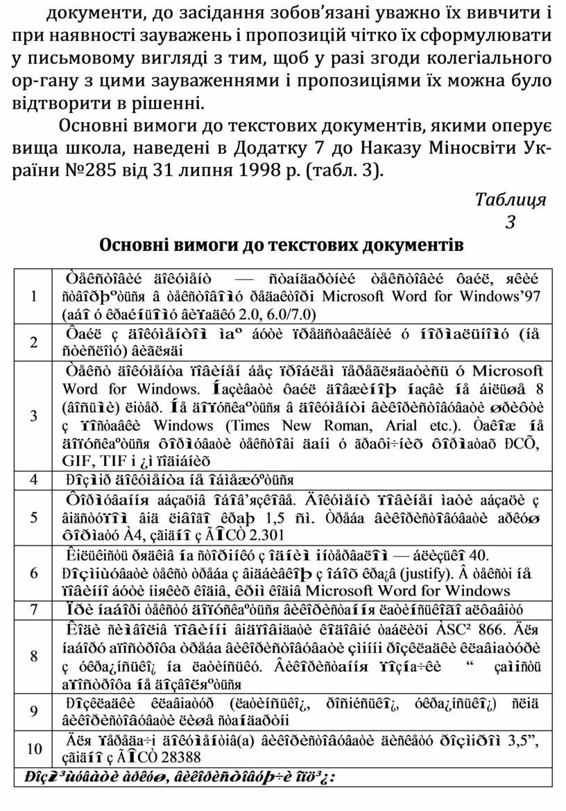 Основні вимоги до текстових документів, якими оперує вища школа, наведені в Додатку 7 до Наказу Міносвіти Ук- раїни №285 від 31 липня 1998 р. (табл. 3).