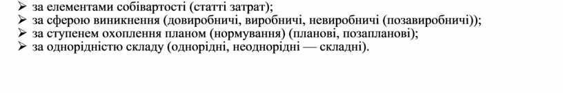 Ø за місцем виникнення — центрам затрат (господарство, підприємство, виробництво, комерційно-структурний підрозділ, дільниця, бригада та інші);
