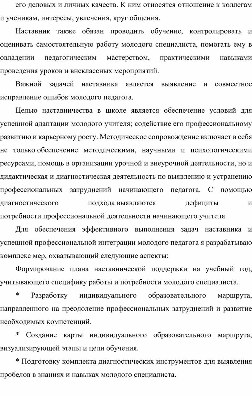 Для обеспечения эффективного выполнения задач наставника и успешной профессиональной интеграции молодого педагога я разрабатываю комплекс мер, охватывающий следующие аспекты: