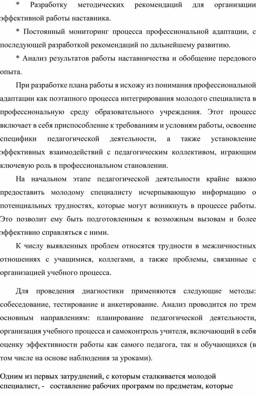 При разработке плана работы я исхожу из понимания профессиональной адаптации как поэтапного процесса интегрирования молодого специалиста в профессиональную среду образовательного учреждения. Этот процесс включает в себя приспособление к требованиям и условиям работы, освоение специфики педагогической деятельности, а также установление эффективных взаимодействий с педагогическим коллективом, играющим ключевую роль в профессиональном становлении.
