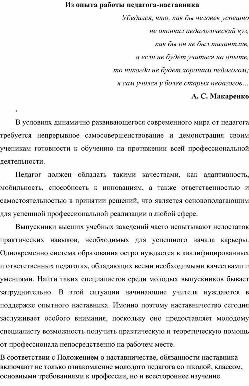 Из опыта работы педагога-наставника
