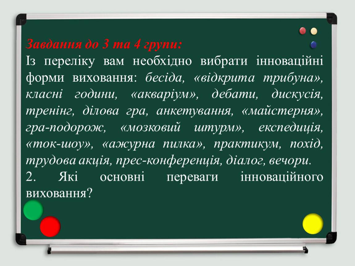 Із переліку вам необхідно вибрати інноваційні форми виховання: бесіда, «відкрита трибуна», класні години, «акваріум», дебати, дискусія, тренінг, ділова гра, анкетування, «майстерня», гра-подорож, «мозковий штурм», експедиція, «ток-шоу», «ажурна пилка», практикум, похід, трудова акція, прес-конференція, діалог, вечори.