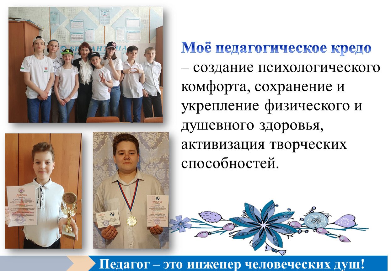 Моё педагогическое кредо – создание психологического комфорта, сохранение и укрепление физического и душевного здоровья, активизация творческих способностей.