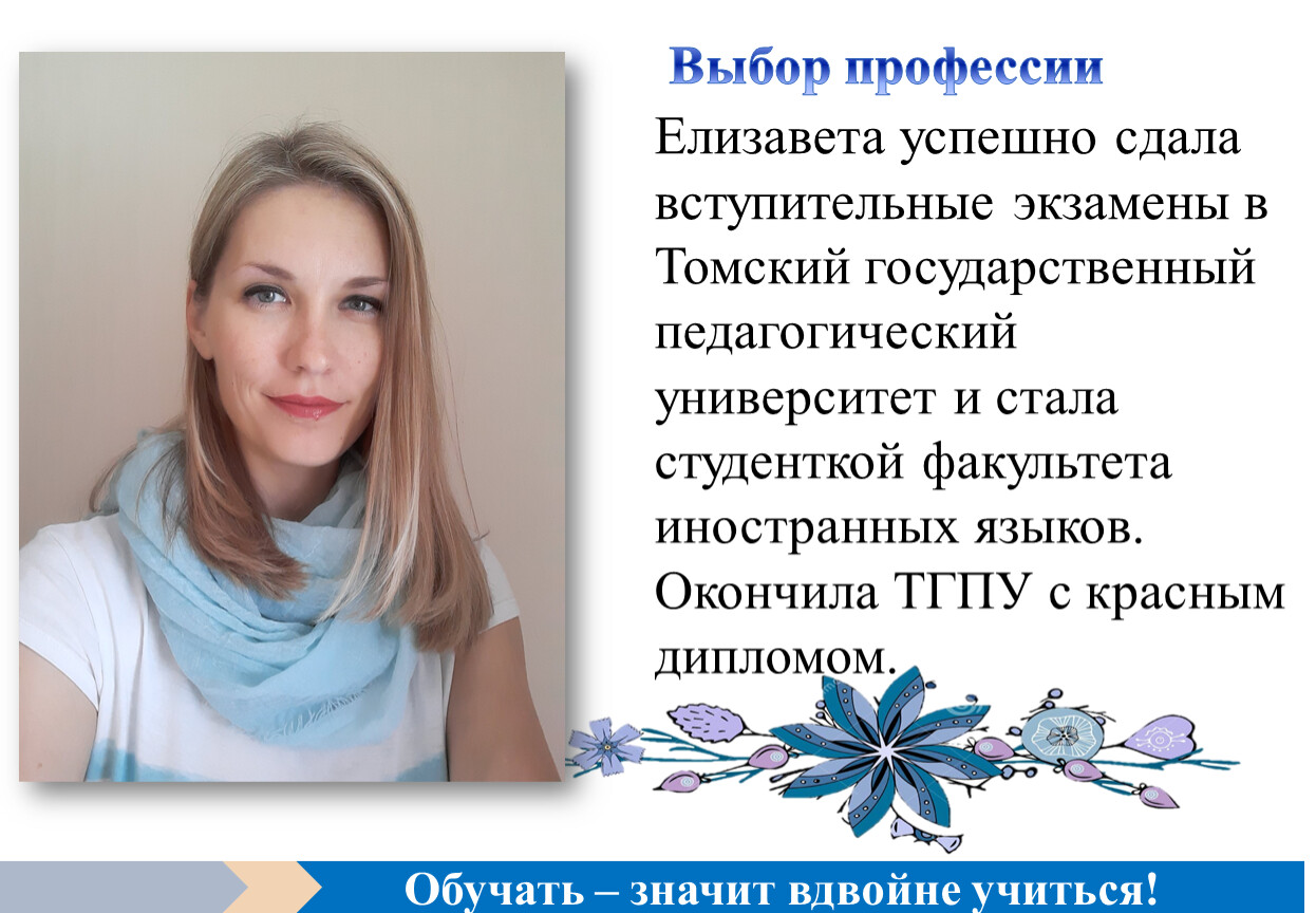 Елизавета успешно сдала вступительные экзамены в Томский государственный педагогический университет и стала студенткой факультета иностранных языков. Окончила ТГПУ с красным дипломом.