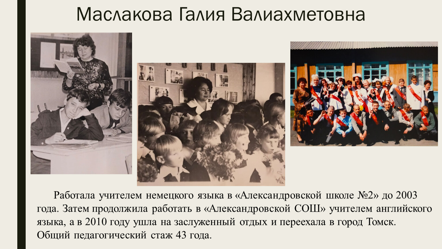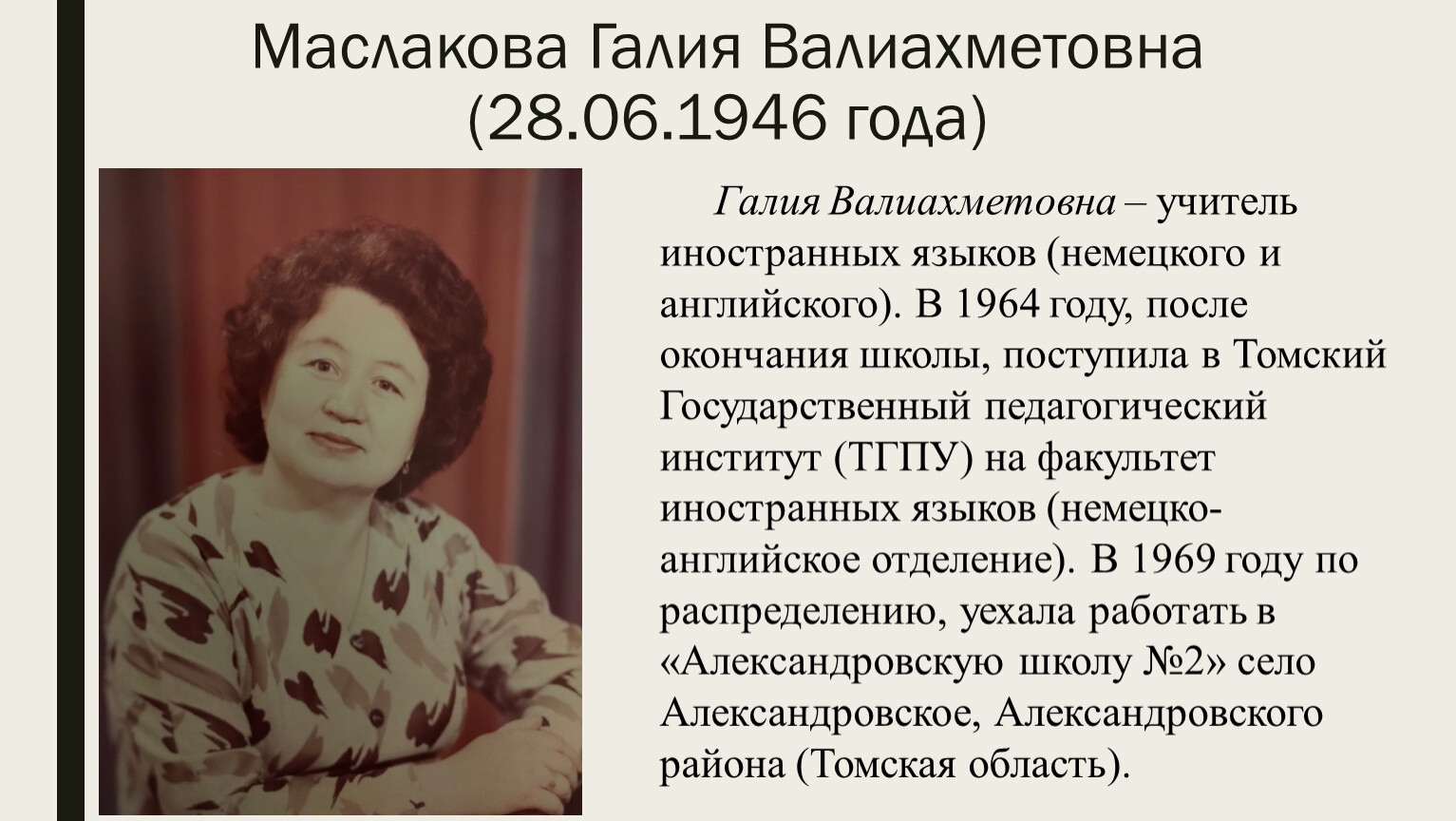 Галия Валиахметовна – учитель иностранных языков (немецкого и английского). В 1964 году, после окончания школы, поступила в Томский Государственный педагогический институт (ТГПУ) на факультет иностранных языков (немецко-английское отделение). В 1969 году по распределению, уехала работать в «Александровскую школу №2» село Александровское, Александровского района (Томская область).