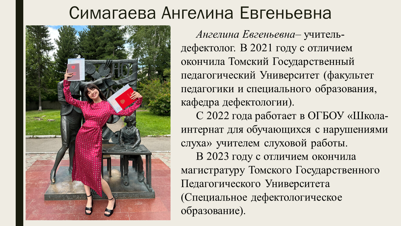 Ангелина Евгеньевна– учитель-дефектолог. В 2021 году с отличием окончила Томский Государственный педагогический Университет (факультет педагогики и специального образования, кафедра дефектологии).