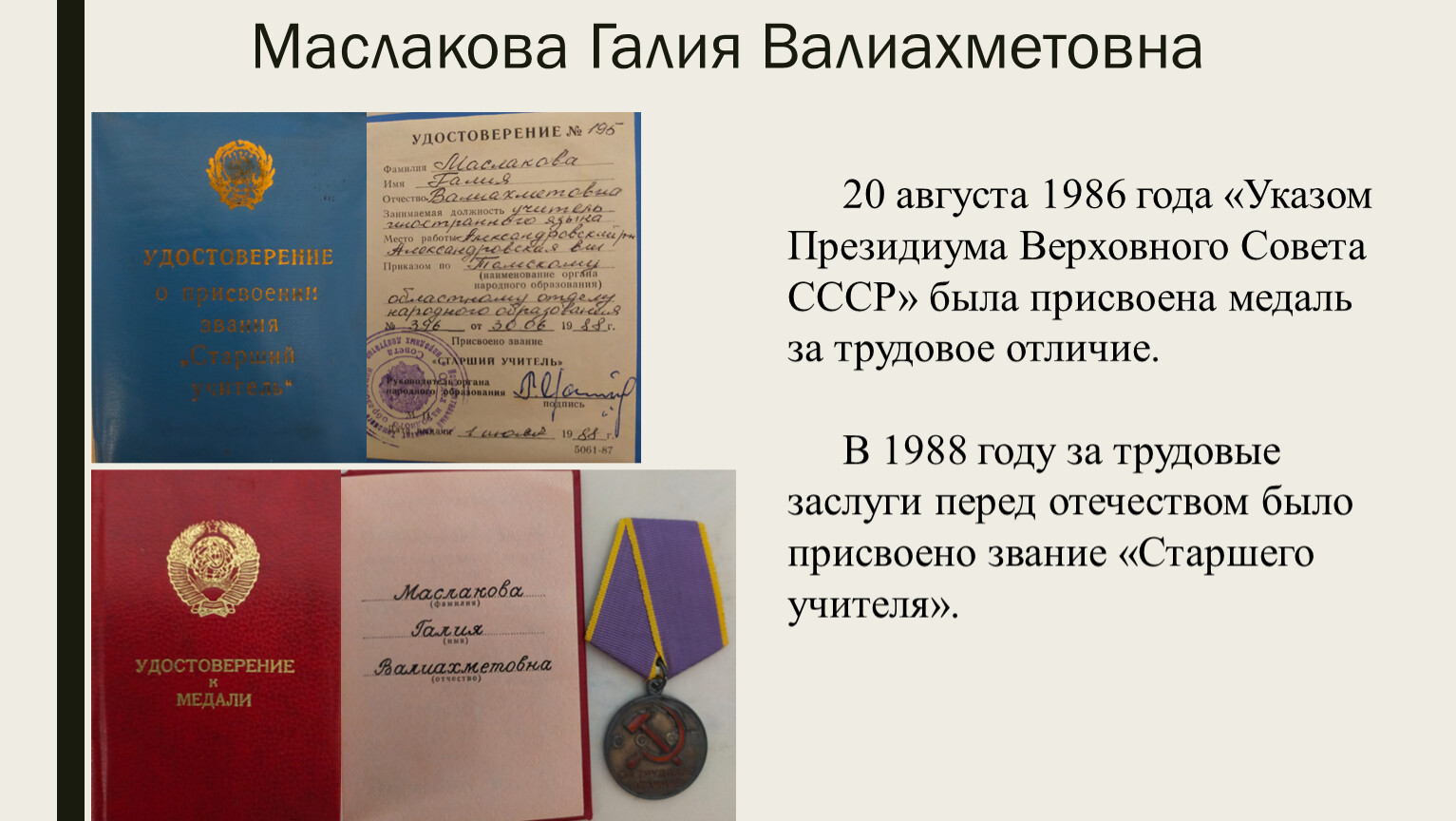 В 1988 году за трудовые заслуги перед отечеством было присвоено звание «Старшего учителя».