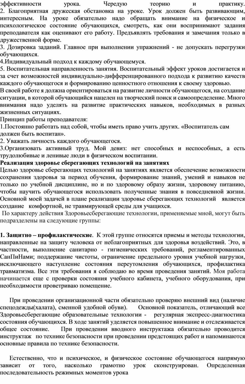 1. Защитно – профилактические. К этой группе относятся приемы и методы технологии, направленные на защиту человека от неблагоприятных для здоровья воздействий. Это, в частности, выполнение санитарно - гигиенических требований, регламентированных СанПиНами; поддержание чистоты, ограничение предельного уровня учебной нагрузки, исключающего наступление состояния переутомления обучающихся, профилактика травматизма. Все эти требования я соблюдаю во время проведения занятий. Моя работа начинается еще с проверки состояния учебного кабинета, учебного оборудования, при необходимости проветриваю помещение.