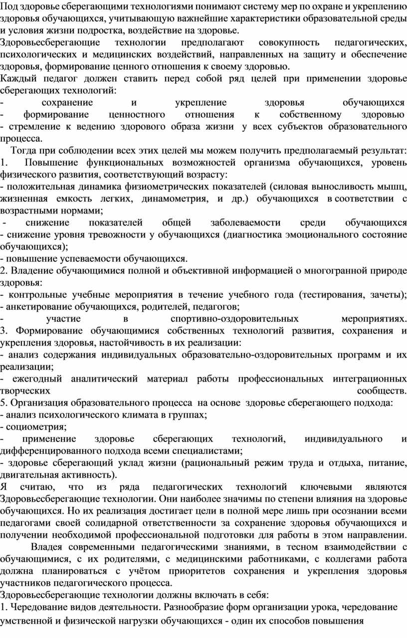 Под здоровье сберегающими технологиями понимают систему мер по охране и укреплению здоровья обучающихся, учитывающую важнейшие характеристики образовательной среды и условия жизни подростка, воздействие на здоровье.