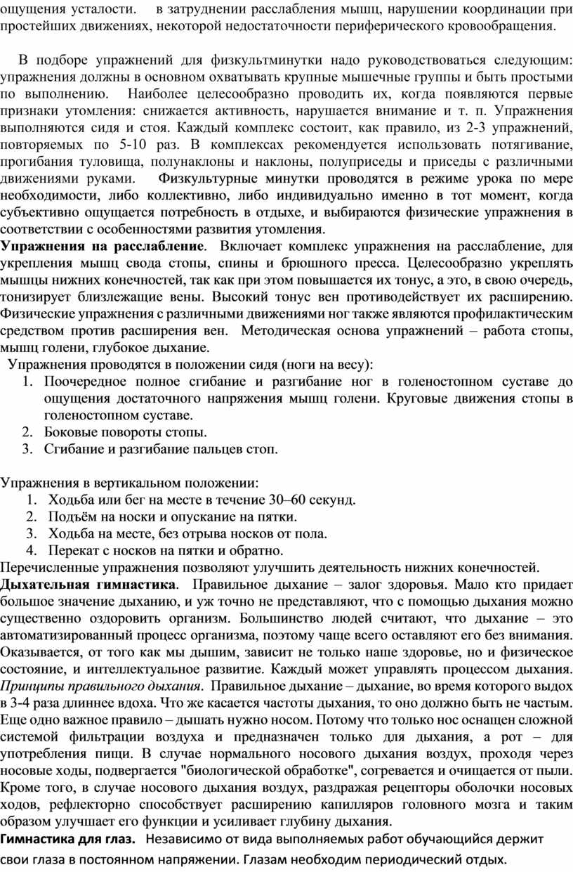 II период (оптимальной работоспособности) включает наиболее трудоемкие и ответственные фрагменты (самостоятельная работа). Это период длительного активного внимания и работоспособности. В этот период мной проводятся целевые обходы в ходе которых контролируется правильность выполнения трудовых приемов, соблюдение технологического процесса. Это самый напряженный в физическом и эмоциональном плане момент урока. Именно в этот период я провожу с обучающимися физкультминутки. Во время перемен помещение проветривается. Еще один важный момент который мной контролируется при целевых обходах – рабочее положение и организация рабочего места. Оптимальная, наиболее эффективная рабочая поза и организованное рабочее место важный момент на пути достижения трудовой цели производственного процесса. Только та поза будет эффективна, которая отвечает требованиям производственного процесса и одновременно удовлетворяет принципам гигиены и физиологии. Обучая обучающихся решать эту практическую и важную для их здоровья задачу, рекомендую им руководствоваться следующими правилами: