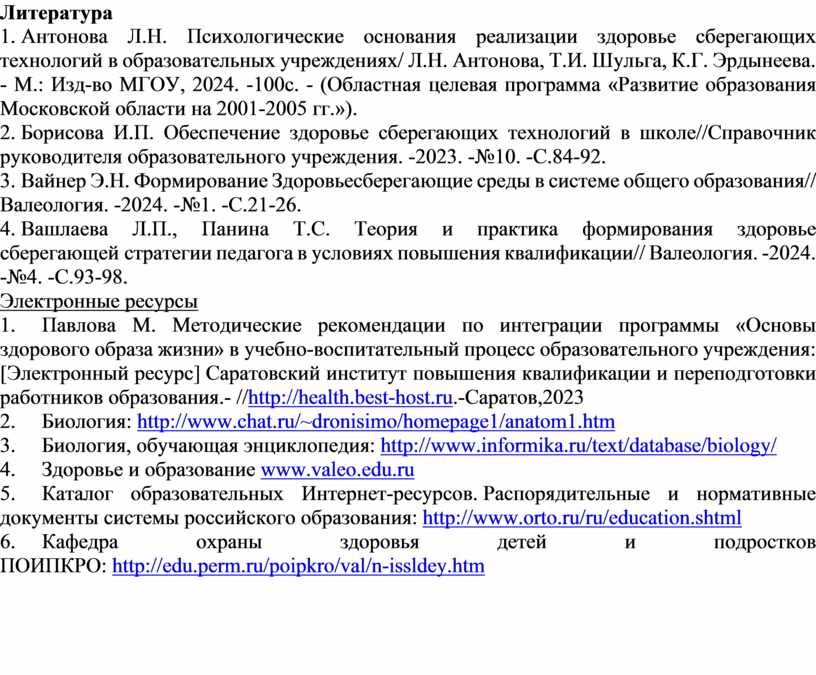 1. Павлова М. Методические рекомендации по интеграции программы «Основы здорового образа жизни» в учебно-воспитательный процесс образовательного учреждения: [Электронный ресурс] Саратовский институт повышения квалификации и переподготовки работников образования.- //http://health.best-host.ru.-Саратов,2023