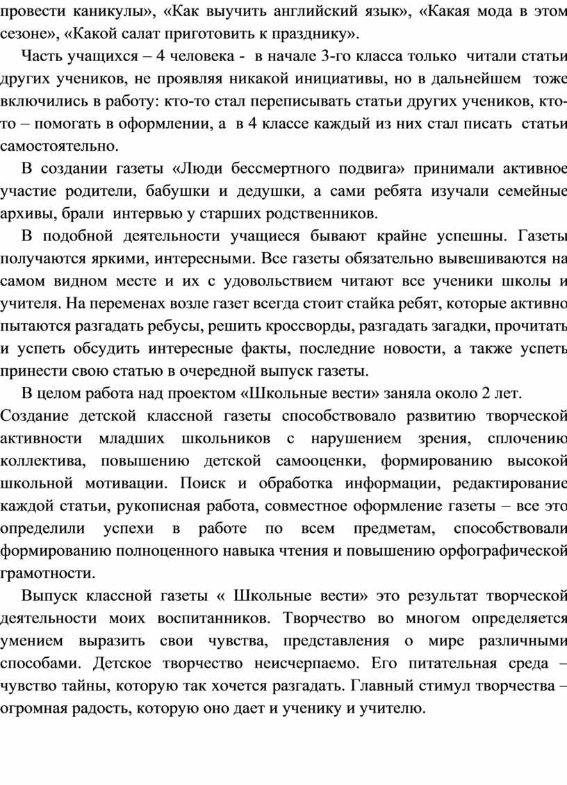 Создание детской классной газеты способствовало развитию творческой активности младших школьников с нарушением зрения, сплочению коллектива, повышению детской самооценки, формированию высокой школьной мотивации. Поиск и обработка информации, редактирование каждой статьи, рукописная работа, совместное оформление газеты – все это определили успехи в работе по всем предметам, способствовали формированию полноценного навыка чтения и повышению орфографической грамотности.
