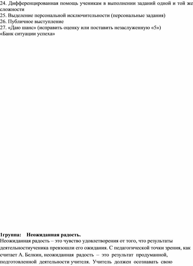 Неожиданная радость – это чувство удовлетворения от того, что результаты деятельностиученика превзошли его ожидания. С педагогической точки зрения, как считает А. Белкин, неожиданная радость – это результат продуманной, подготовленной деятельности учителя. Учитель должен осознавать свою сопричастность к успеху, осмысливать творческое начало в своей деятельности, должен быть убежден в правильности применяемых методов. Трудно говорить о каких-то специальных приемах создания неожиданной радости. Но что-то общее все-таки существует. Можно выявить определенные закономерности, разработать своеобразные алгоритм педагогических действий.