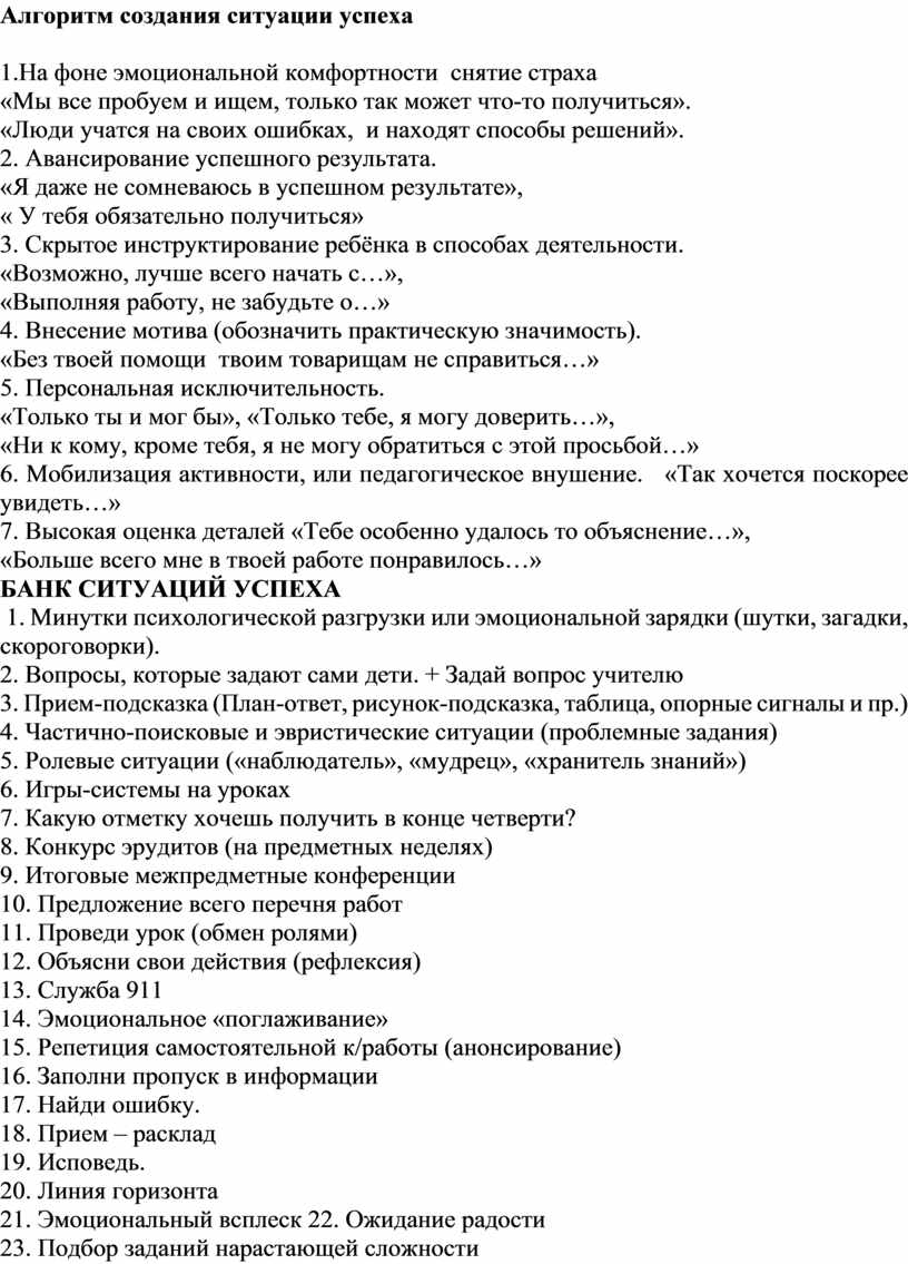 1. Систематизировать приемы и методы создания ситуации успеха учащихся
