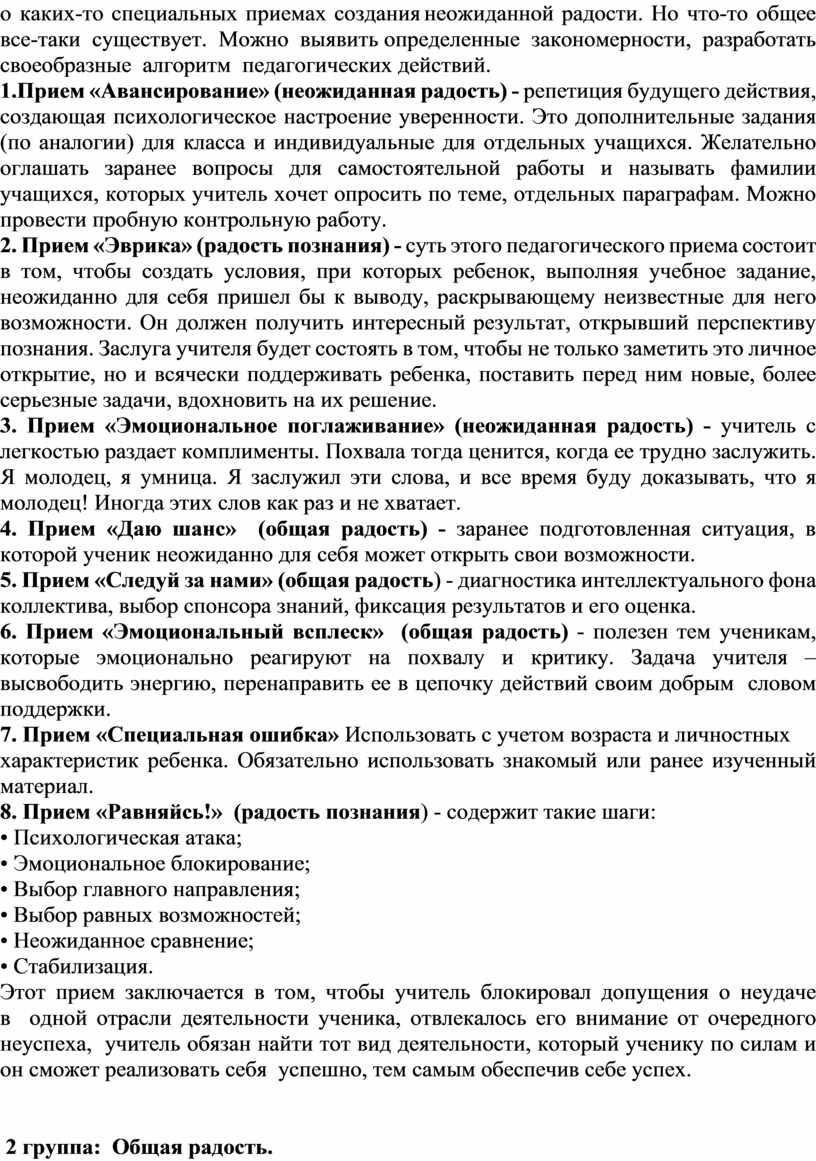 6. Прием «Эмоциональный всплеск» (общая радость) - полезен тем ученикам, которые эмоционально реагируют на похвалу и критику. Задача учителя – высвободить энергию, перенаправить ее в цепочку действий своим добрым словом поддержки.