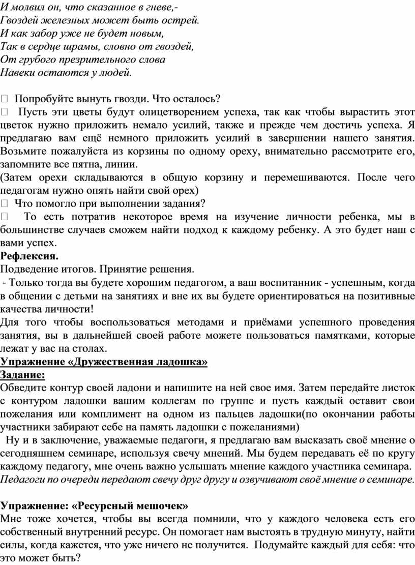 -Я хочу предложить вам участие в одной интересной игре. Нам очень редко говорят добрые слова по поводу нашей профессиональной деятельности. Я думаю, что сейчас вы сели рядом с тем человеком, который вам знаком не только как учитель, но и как человек, с которым вам приятно общаться. У вас есть уникальная возможность выразить свои добрые мысли и чувства по отношению к справа сидящему соседу по поводу его профессиональных качеств. Для этого необходимо взять в свою руку руку соседа и сказать ему эти слова.( Игра проходит по цепочке от первого участника до последнего).