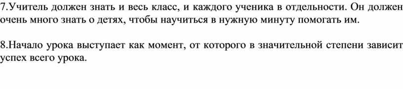 7.Учитель должен знать и весь класс, и каждого ученика в отдельности. Он должен очень много знать о детях, чтобы научиться в нужную минуту помогать им.