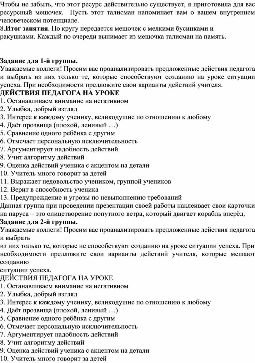 Уважаемые коллеги! Просим вас проанализировать предложенные действия педагога и выбрать из них только те, которые способствуют созданию на уроке ситуации успеха. При необходимости предложите свои варианты действий учителя.
