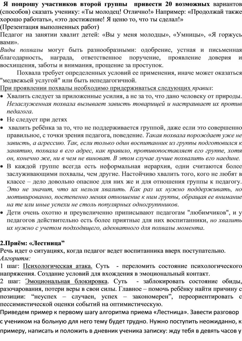 · Хвалить следует за приложенные усилия, а не за то, что дано человеку от природы. Незаслуженная похвала вызывает зависть товарищей и настраивает их против педагога.