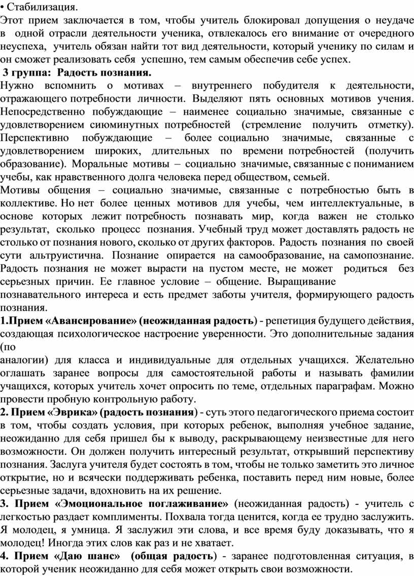 3. Прием «Эмоциональное поглаживание» (неожиданная радость) - учитель с легкостью раздает комплименты. Похвала тогда ценится, когда ее трудно заслужить. Я молодец, я умница. Я заслужил эти слова, и все время буду доказывать, что я молодец! Иногда этих слов как раз и не хватает.